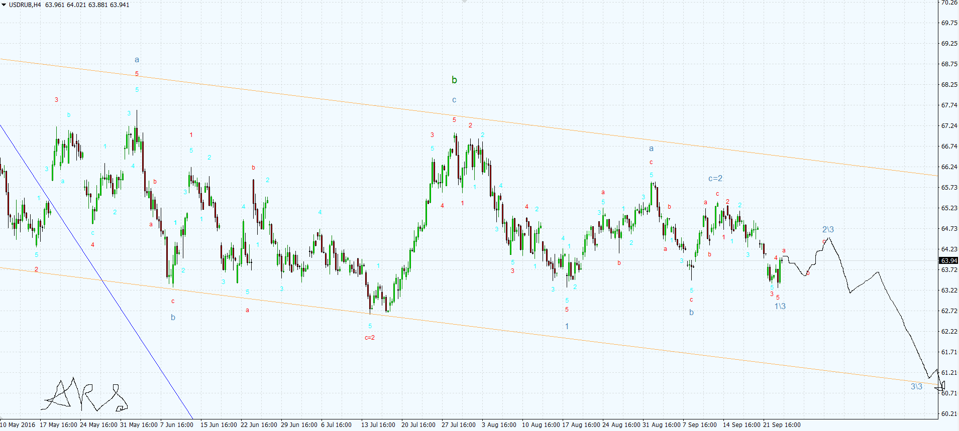 Предыдущий прогноз отработал хорошо! особенно по евре. Сначала завершилась сложная двойная корекция- образовав волну b-зеленая, после чего цена отправилась в новый цикл, волну с, в которой завершается формирование первой волны-синия.